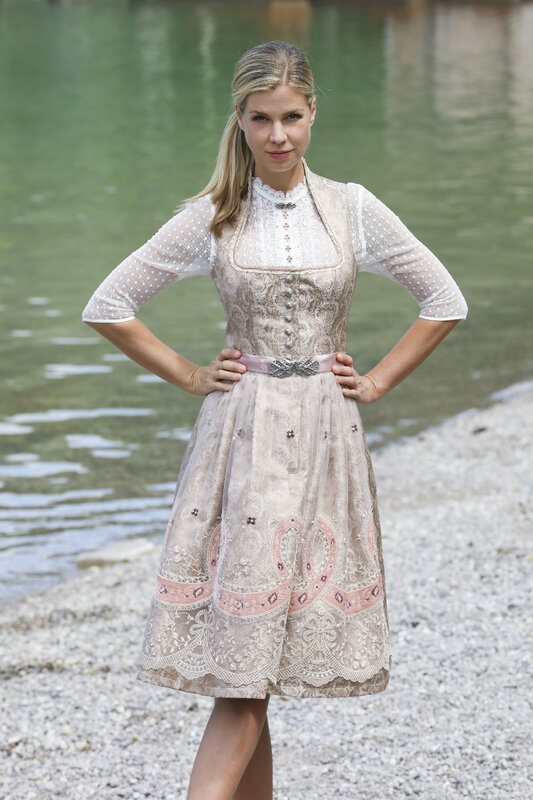 Für einen schlichten, zurückhaltenden Look kombinieren Sie ein weißes Brautdirndl mit einer seidenen Schleife in Taupe oder in einem zarten Pastellton mit einer dezenten Spitzenbluse in einem hellen Farbton und dazu passenden, spitz zulaufenden Pumps mit Spitzenapplikationen. In einem farblich mit der Schleife abgestimmten Stoffbeutel können Sie Kleinigkeiten wie Puderdose, Lippenstift, Handy und Schlüssel bei sich tragen.Besonders elegant und glamourös ist ein knielanges Dirndl in Creme mit goldfarbener Seidenschürze mit aufwändigen Stickereien und edlen Verzierungen im Bereich des Dekolletees. Dazu passen creme- oder goldfarbene Schuhe und Accessoires. Sehr schön sind auch Brautdirndl mit reichlich besticktem Oberteil oder eine Variante mit Perlenbesatz und kleinen Kettchen.