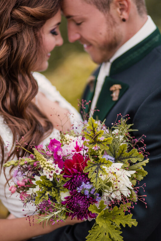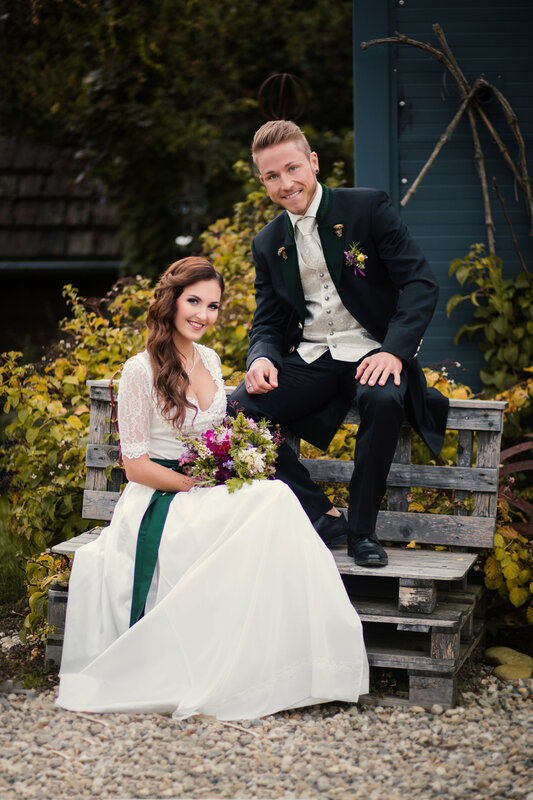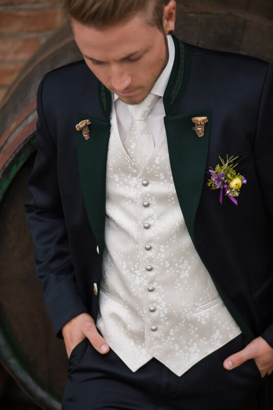 Komplettiert wird das Outfit des Bräutigams nicht nur mit Haferlschuhen, handgestrickten Loferl, Trachtenhemd und Trachtenjanker. Für die eigene Hochzeit wird immer öfter zu Trachtenweste und Einstecktuch gegriffen, beides wertet das perfekte Trachtenoutfit nicht nur auf, sondern kann auch wunderbar farblich auf das Brautdirndl abgestimmt werden. So entsteht ein harmonisches Bild des Brautpaares.
